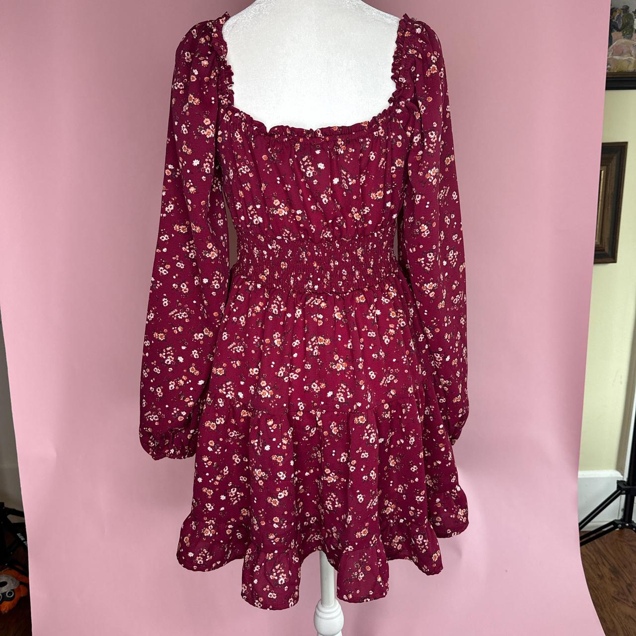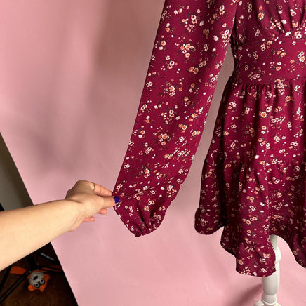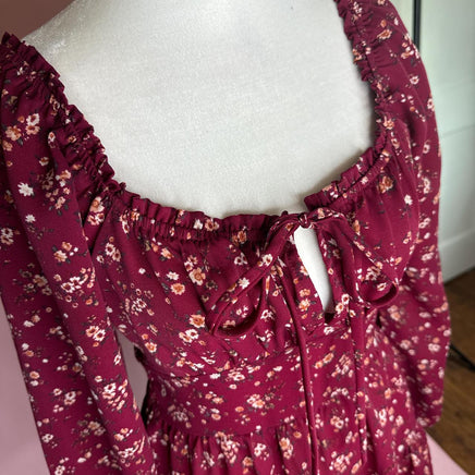 Burgundy floral mini dress with long sleeves and a sweetheart neckline #boho #cottage