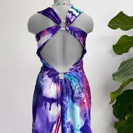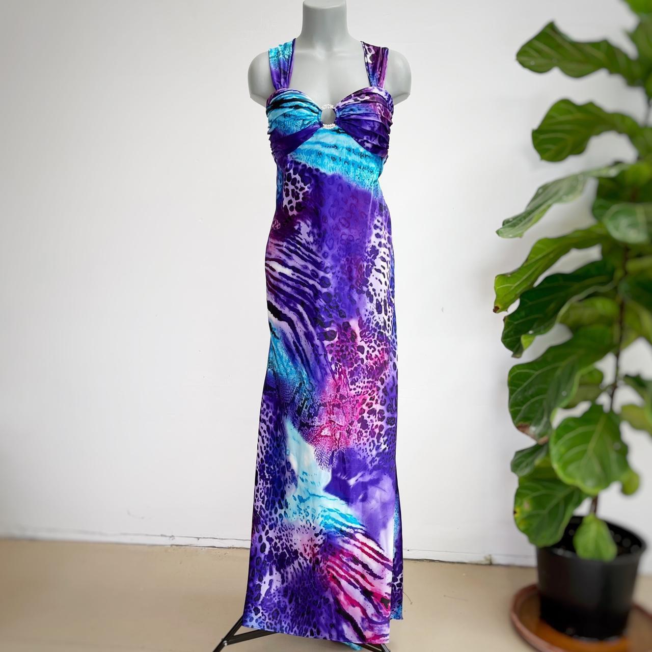Late 90s/y2k maxi dress in a blue and purple watercolor animal print fabric. Ruched bust with rhinestone o-ring center. Bias cut with racerback straps and more rhinestone detail. Zips up the side. Super flattering cut! Made in the USA; little wear-great condition!