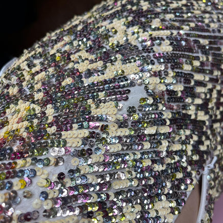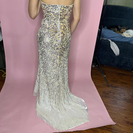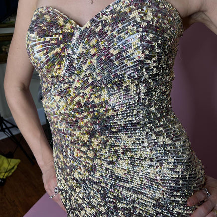 sequin dress, strapless gown, vintage formal, embellished evening, glitzy attire, party dress, elegant nightwear, luxurious fabric, retro glamour, sparkly evening