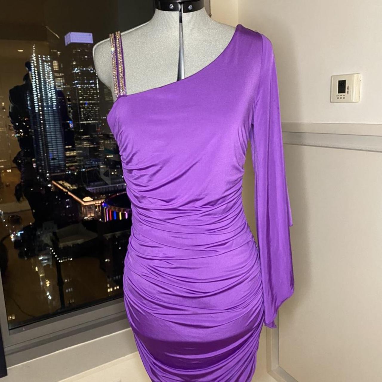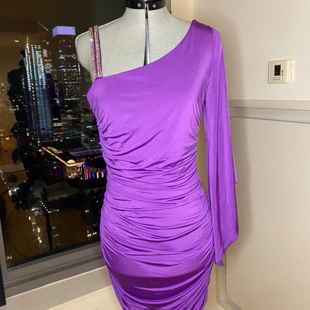 Vintage one shoulder stretchy rhinestone ruched bodycon dress