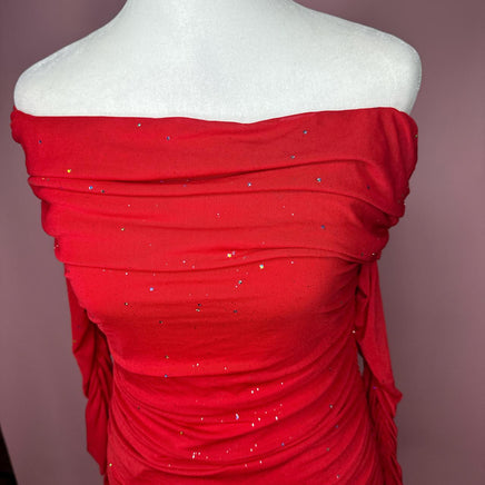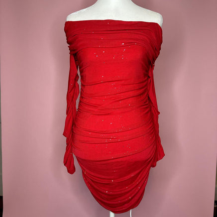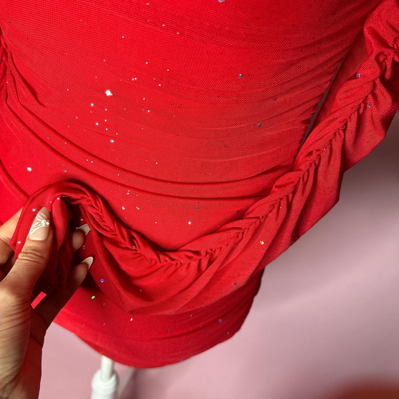 Red ruched mini dress with sparkly sleeves #glam #partydress